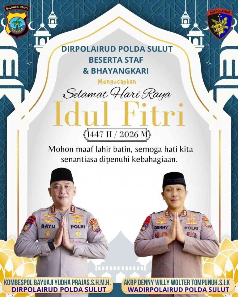 Dalam menyambut Hari Raya Idulfitri 1447 Hijriah, jajaran Direktorat Polisi Perairan dan Udara Polda Sulawesi Utara bersama Bhayangkari menyampaikan ucapan selamat kepada masyarakat. Momentum Idulfitri dimaknai sebagai waktu untuk mempererat kebersamaan serta memperkuat semangat saling memaafkan setelah menjalani ibadah puasa di bulan Ramadan.